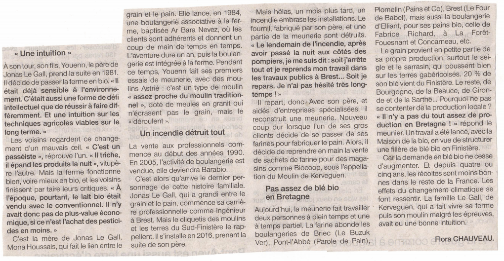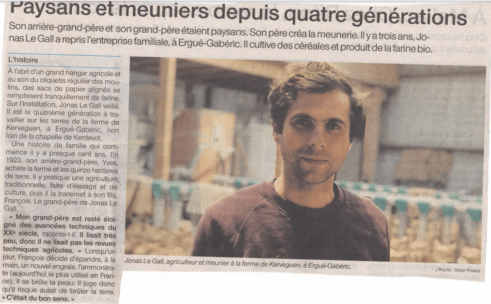 Pour faire connaissance avec notre fournisseur de farines et de graines (vrac) « Quatre générations de paysans et de meuniers à la ferme de Kerveguen » (Ouest France)