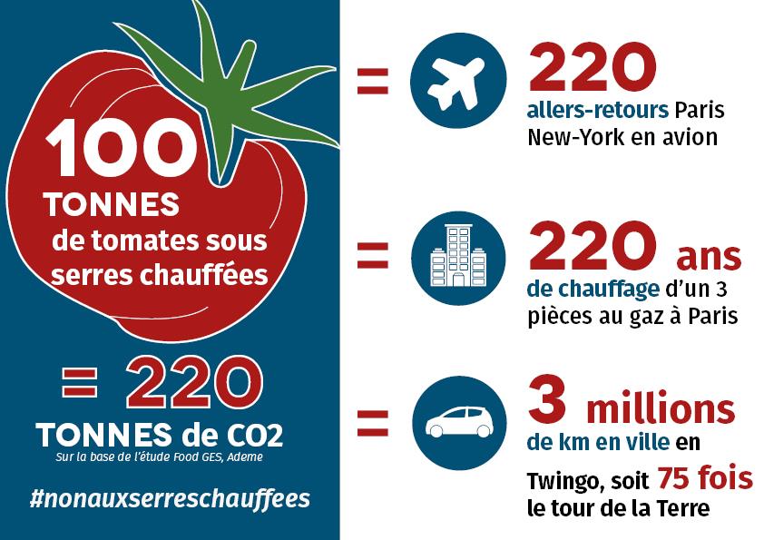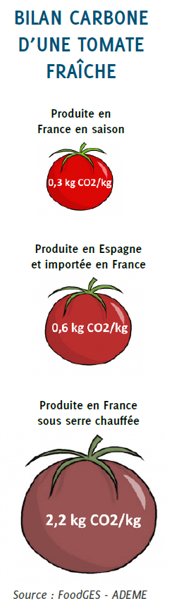 Selon une étude de l’Ademe (Agence de l’environnement et de la maîtrise de l’énergie), une tomate produite sous serre chauffée émettrait, avec 2,2 kilos de CO2 pour un kilo de tomates, sept fois plus de gaz à effet de serre qu’une tomate produite en France en saison et près de quatre fois plus qu’une tomate importée d’Espagne.
