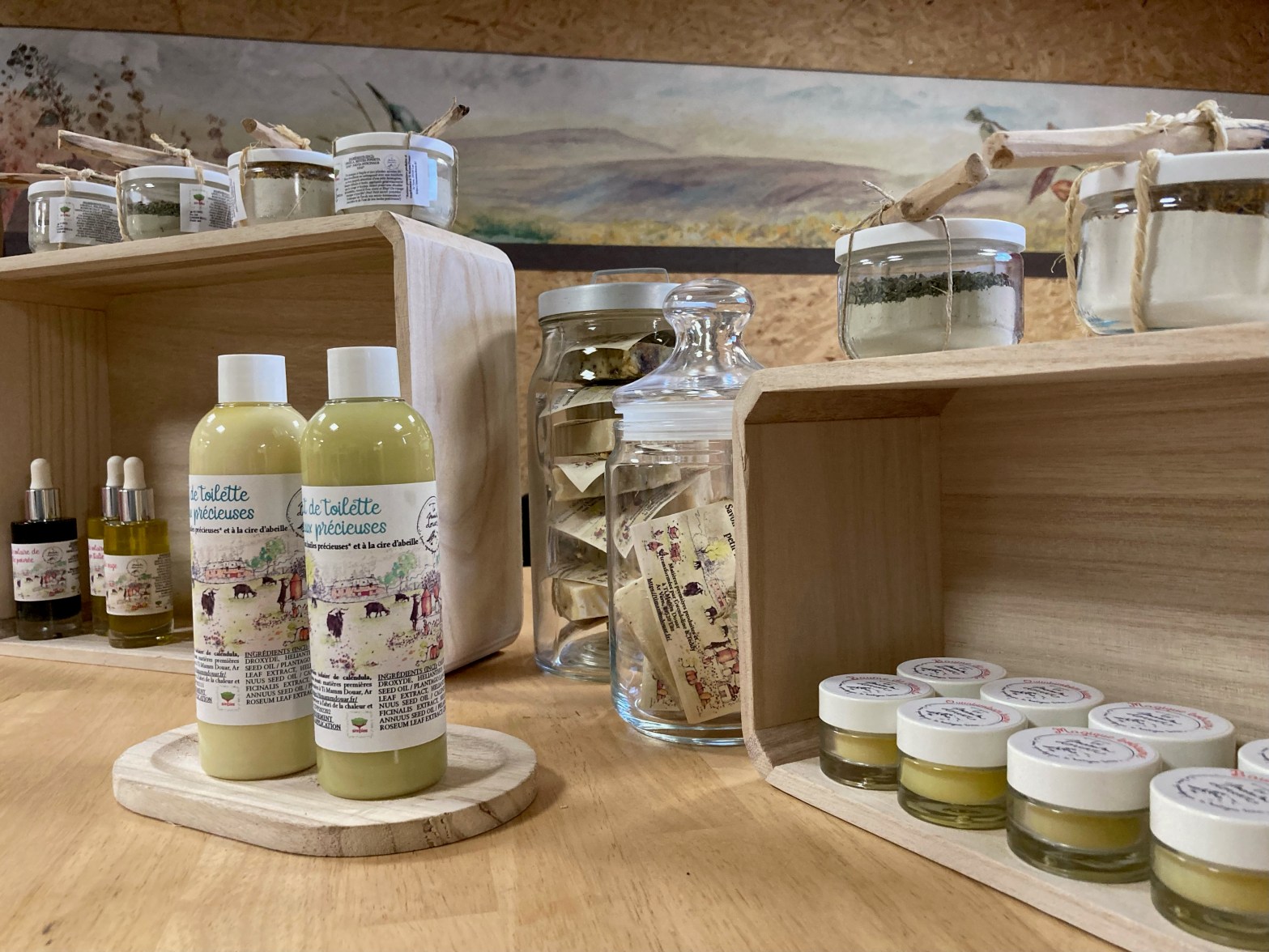 Des masques à l’argile et aux plantes à laisser infuser avant d’appliquer (tiède ou froid), des baumes, un liniment (ou lait de toilette), des savons surgras, saponifiés à froid à base de lait de chèvre. Et enfin des huiles précieuses et solaires.